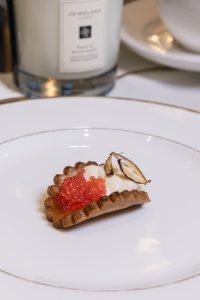• Taco Sable, Diplomat Kreması, Kırmızı Elma ve Gül Havyarı – Çiçeksi bir lezzet, unutulmaz bir harman